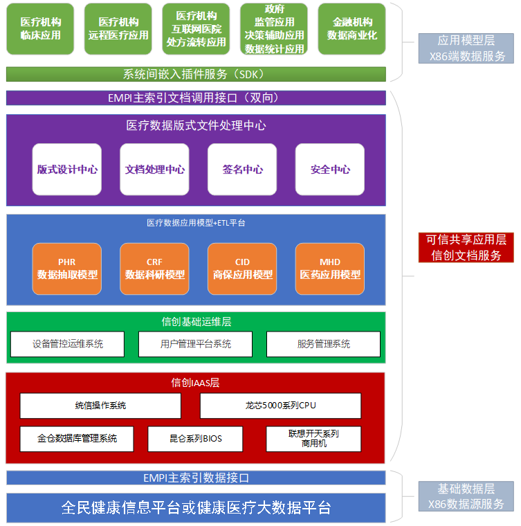 方案以区域全民健康信息平台或健康医疗大数据平台作为数据源,通过信息平台提供的EMPI患者主索引系统与文件共享中心接口,提取患者包括门诊、住院、急诊以及公共卫生在内的全量医疗数据。多方位保障患者个人的各级医疗数据无错失、零遗漏。