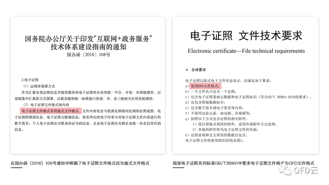 电子证照是指由计算机等电子设备形成、传输和存储的证件、执照等电子文件,相比于纸质证照,电子证照具有成本低、传输快、易验证、防伪造、不会丢、应用方便等优势。从国办函108号通知以及国家电子证照标准看出,我国电子证照的标准格式为OFD文件格式。OFD格式是我国自主研发的开放版式文件标准,OFD格式文件具有体积小、易流转、易阅读、安全性高、不易跑版等优势,贴合电子证照应用的技术需求与应用场景。